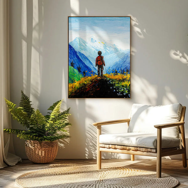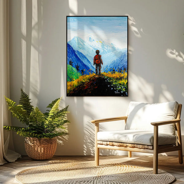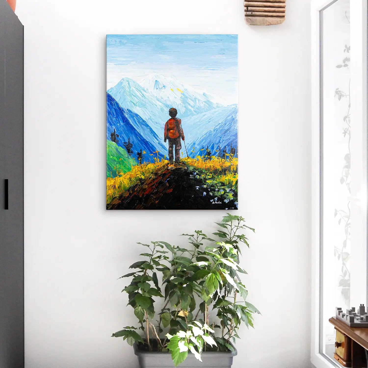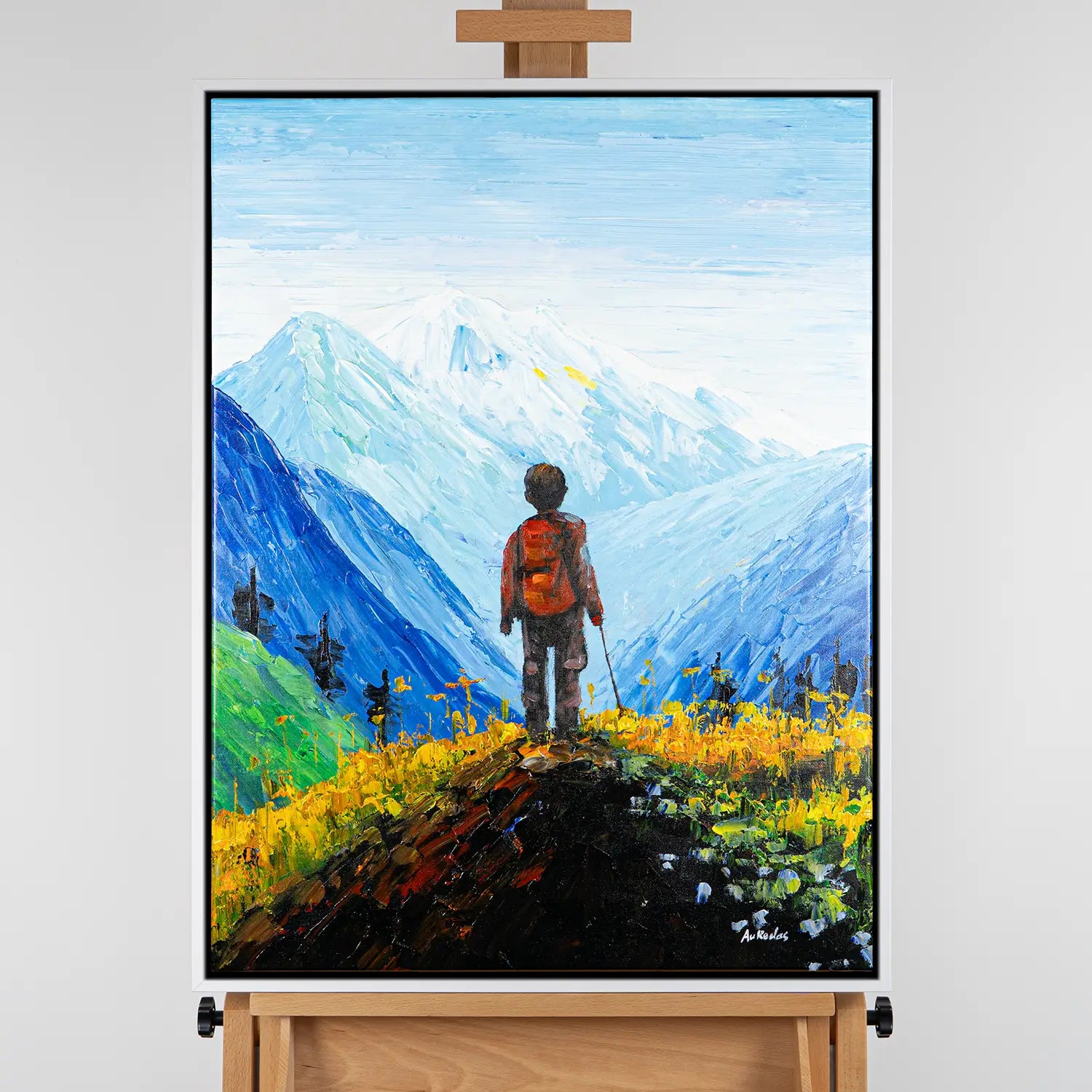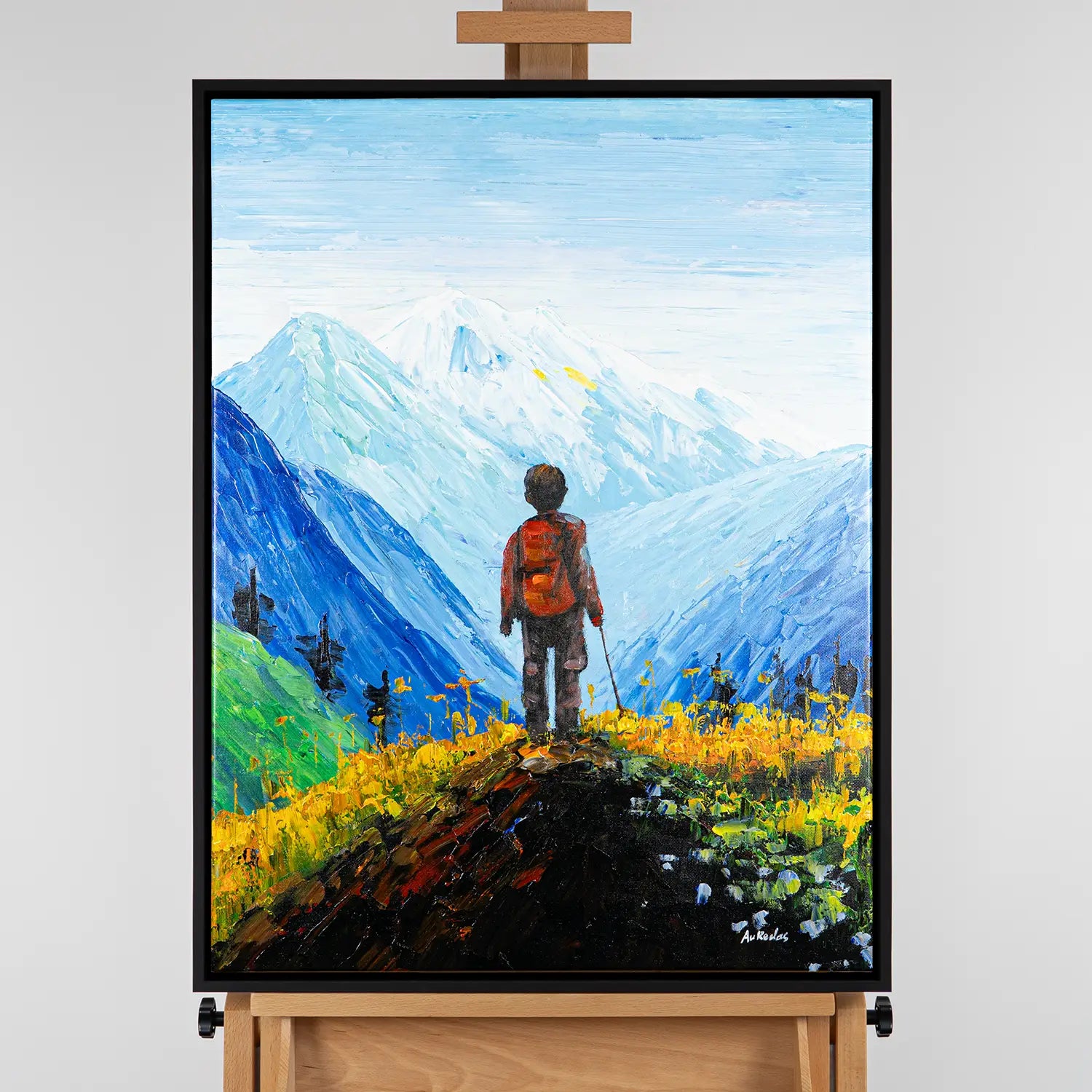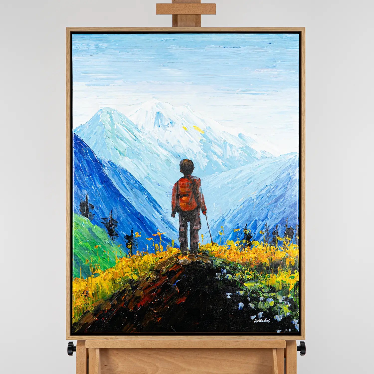 Ein Junge auf einem Hügel stehend, blickt in die Ferne zu einem Berg. Sein Blick spricht von einer Sehnsucht nach dem Unbekannten, dem Erwachsenwerden. Die Wanderung ins Leben wird zur Reise des Erwachens und des inneren Wachstums. Strukturpaste und Acrylfarbe auf Leinwand mit 4cm Keilrahmen verleihen der Szene Tiefe und Bedeutung.
