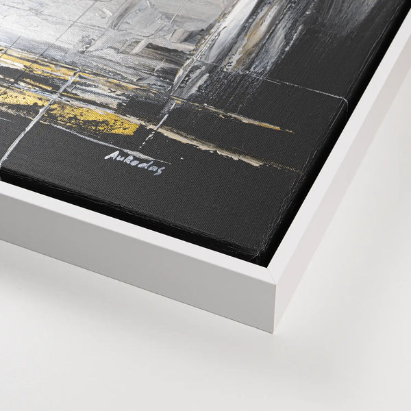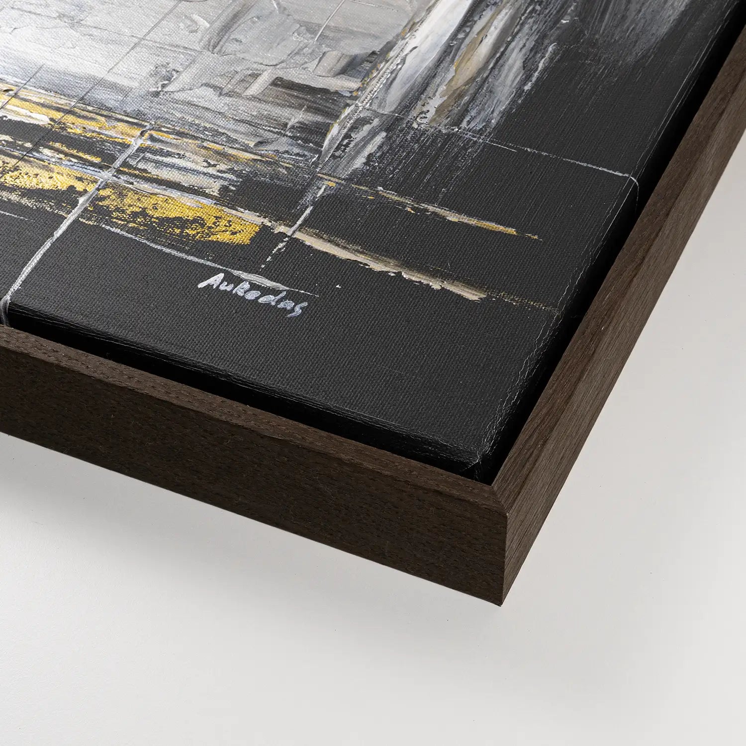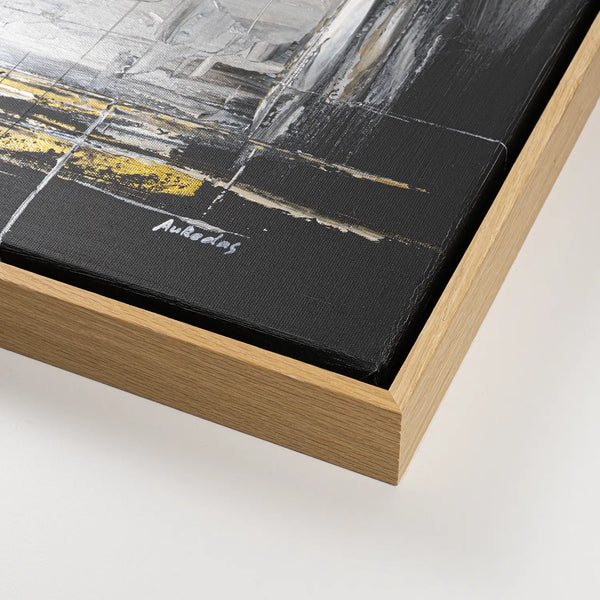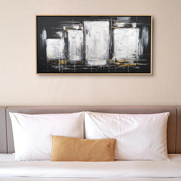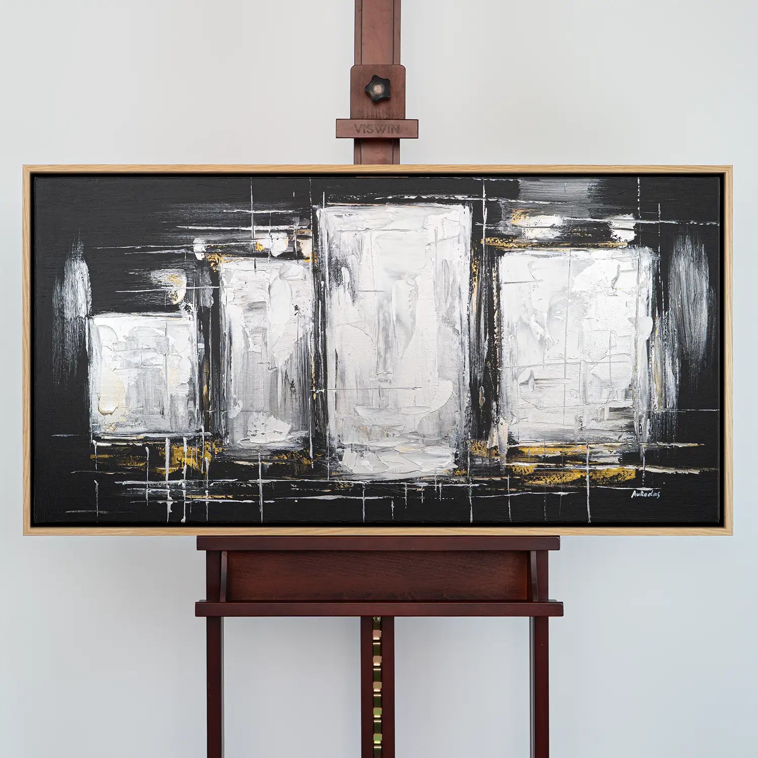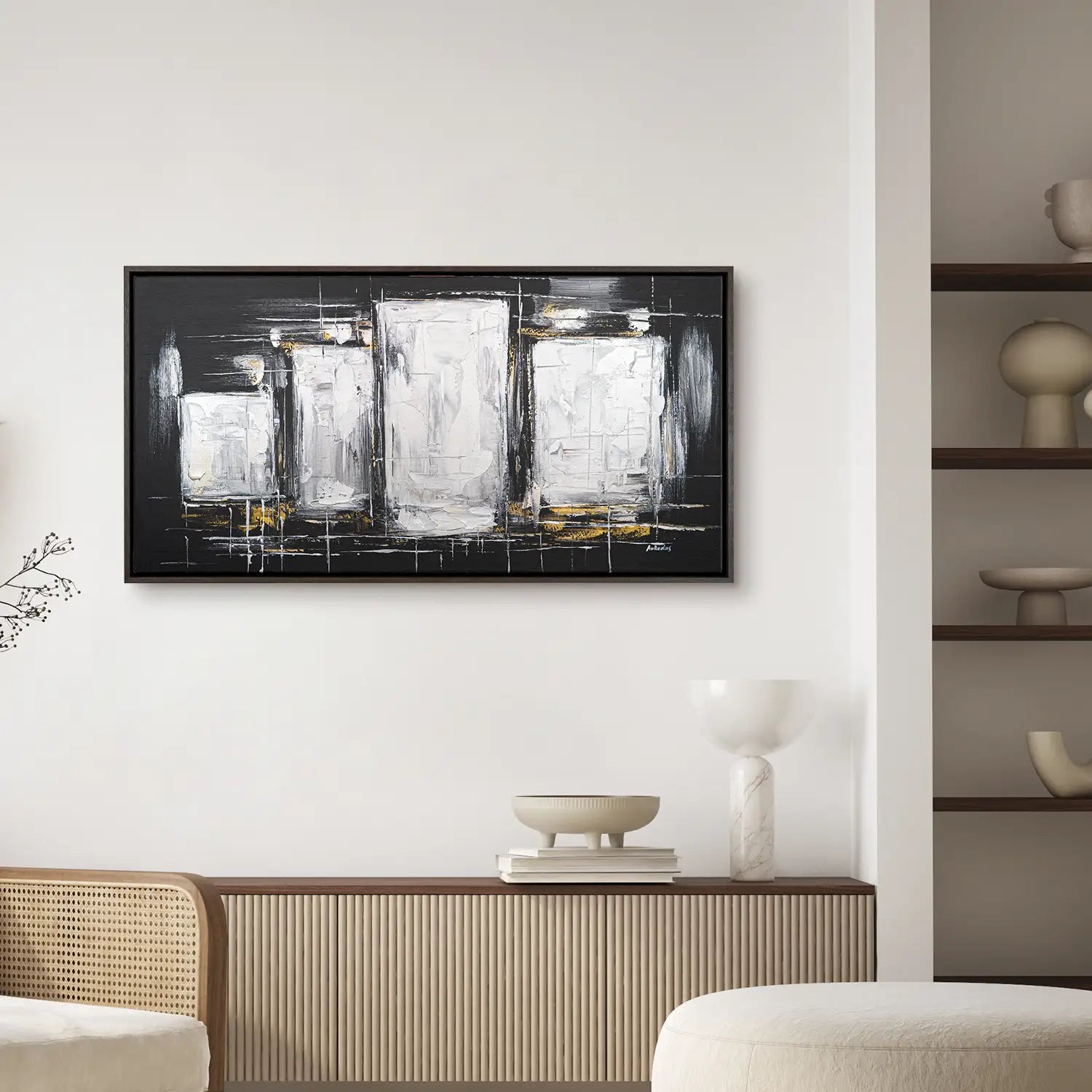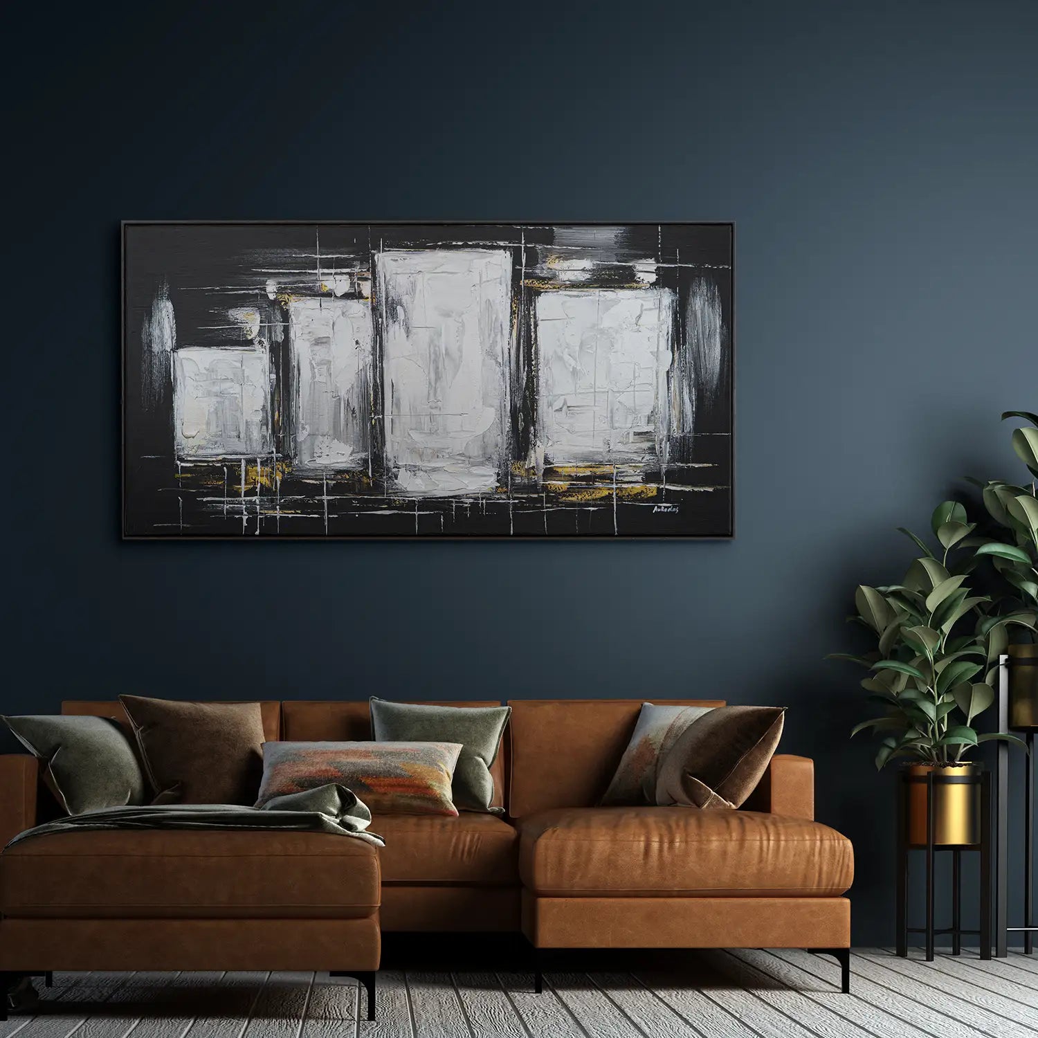 Dieses Gemälde verkörpert die Schönheit des Reduzierten. Rechtecke aus Silber schweben geordnet im Schwarz – ein Symbol für Struktur, Klarheit und innere Balance. „Dunkle Eleganz“ spricht die Sprache des Understatements: modern, kontrolliert und zugleich kraftvoll. Es lädt den Betrachter ein, in der Stille des Minimalismus Tiefe zu entdecken.