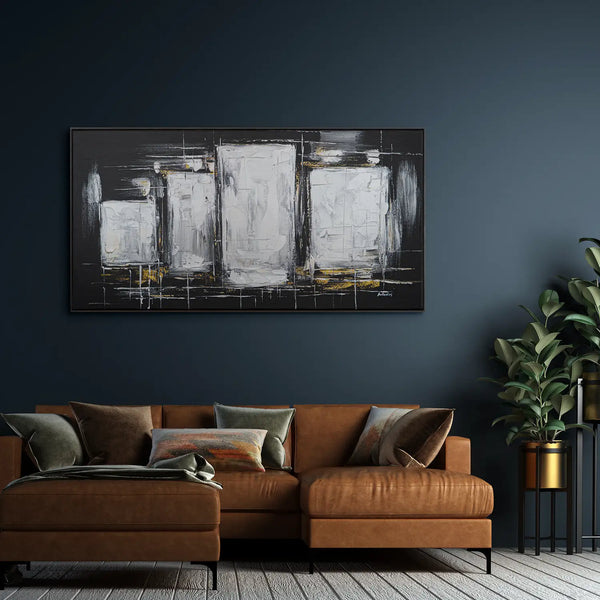 Dunkle Eleganz - Ein modernes, abstraktes Gemälde, das silberne Rechtecke auf einem schwarzen Hintergrund im Panorama Format
