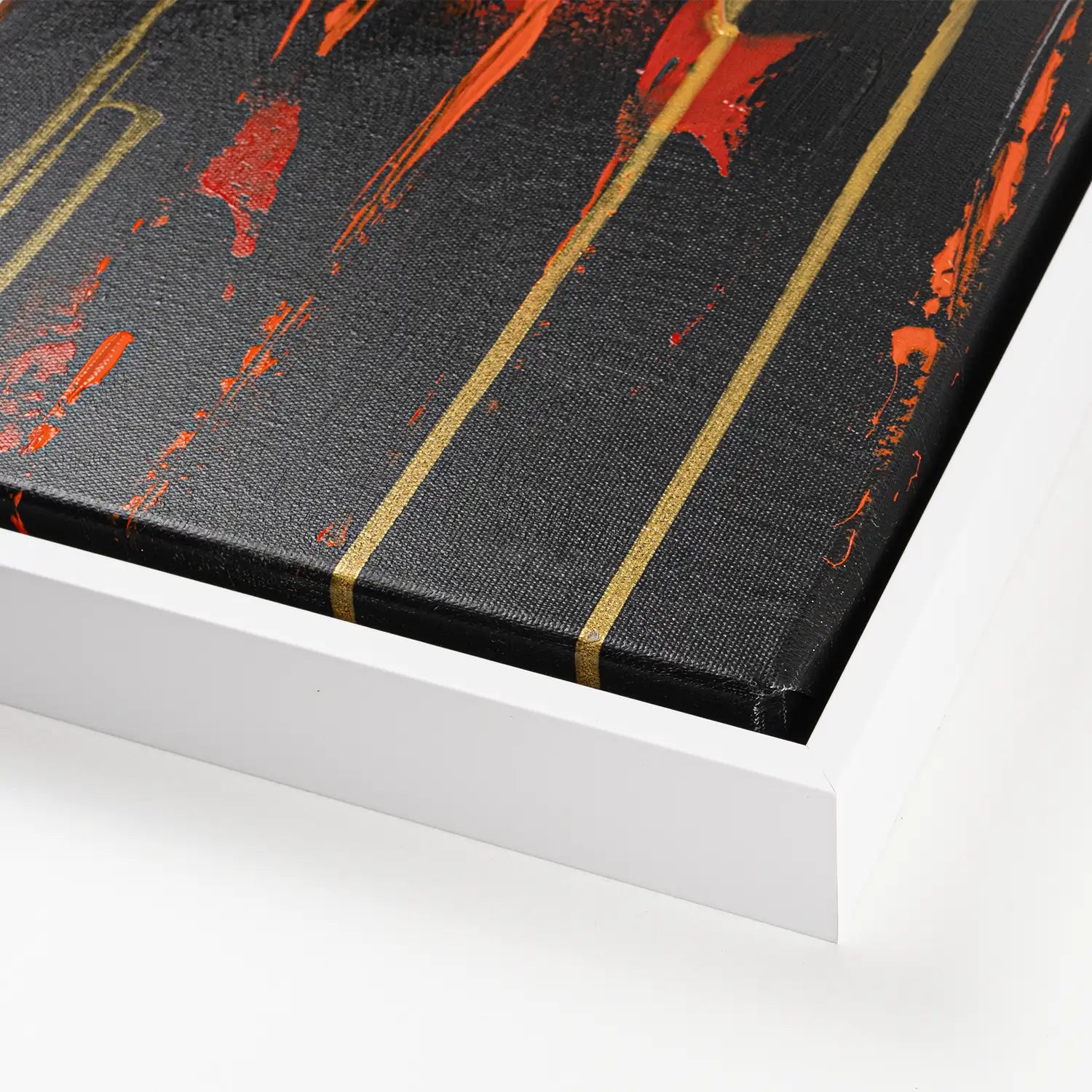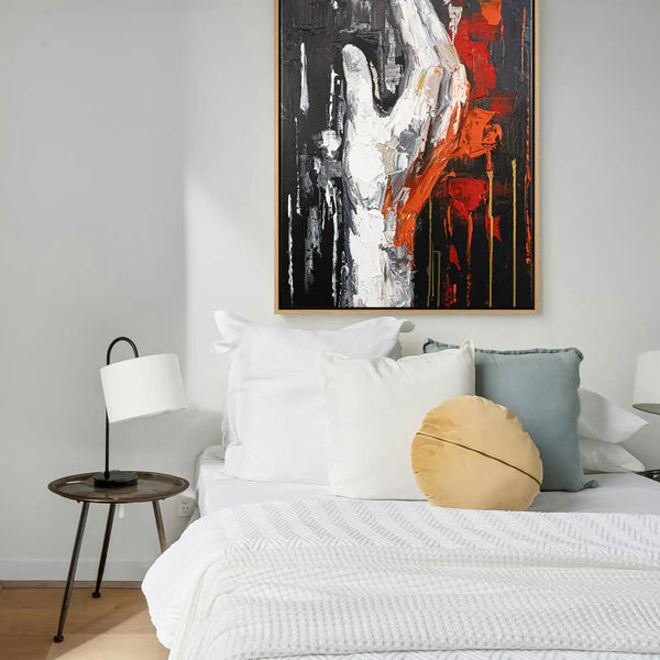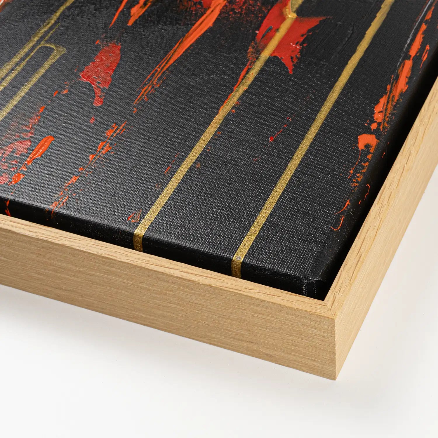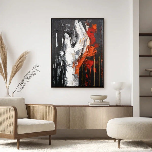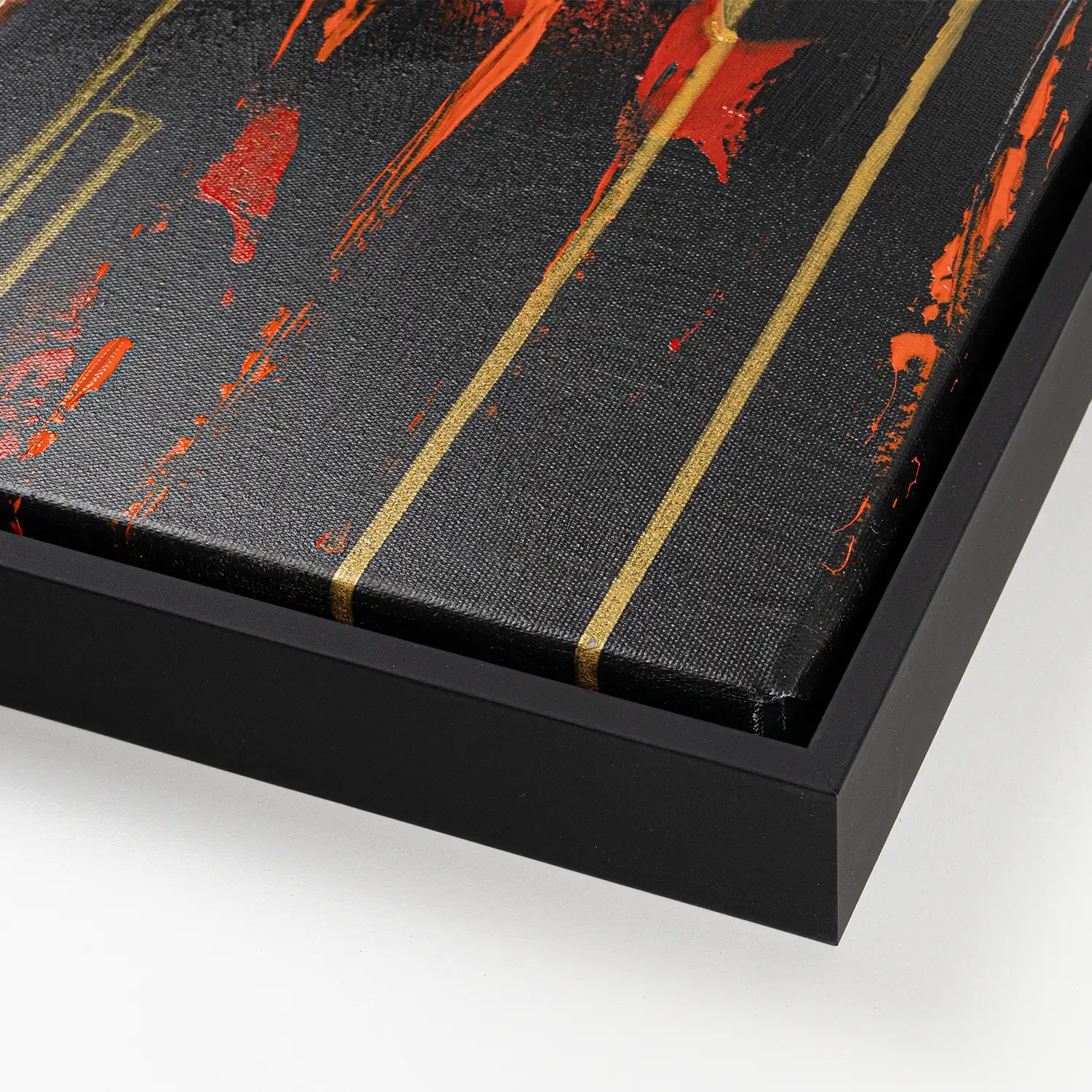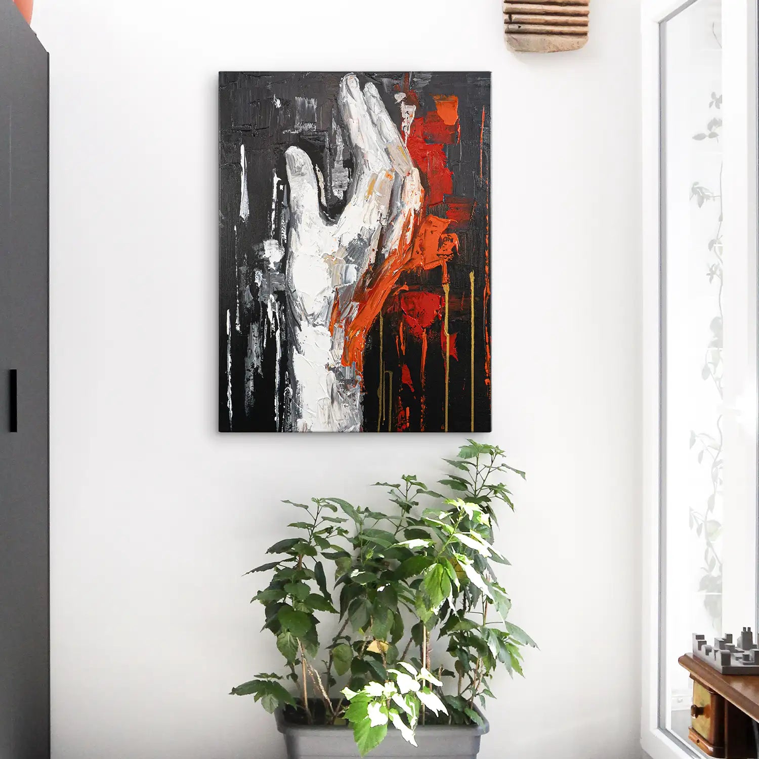 Das Zusammenspiel von Schwarz, Weiß und feurigen Rottönen verleiht „Flamme des Willens“ seine dramatische Wirkung. Strukturpaste betont die plastische Tiefe der Hand und lässt das Feuer lebendig erscheinen. Das Gemälde ist auf einem 4 cm Echtholz-Keilrahmen gefertigt und kann mit Schattenfugenrahmen in Weiß oder Schwarz (foliert) sowie Eiche Hell oder Eiche Dunkel (Echtholz-Optik) stilvoll ergänzt werden.