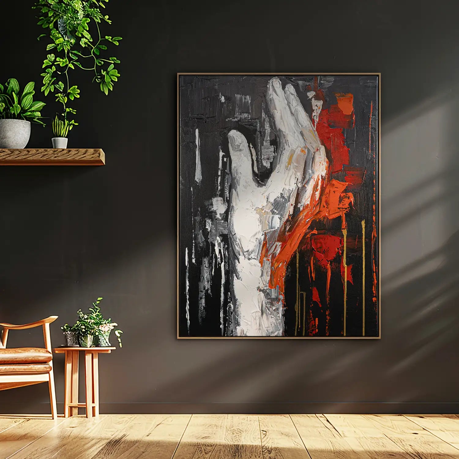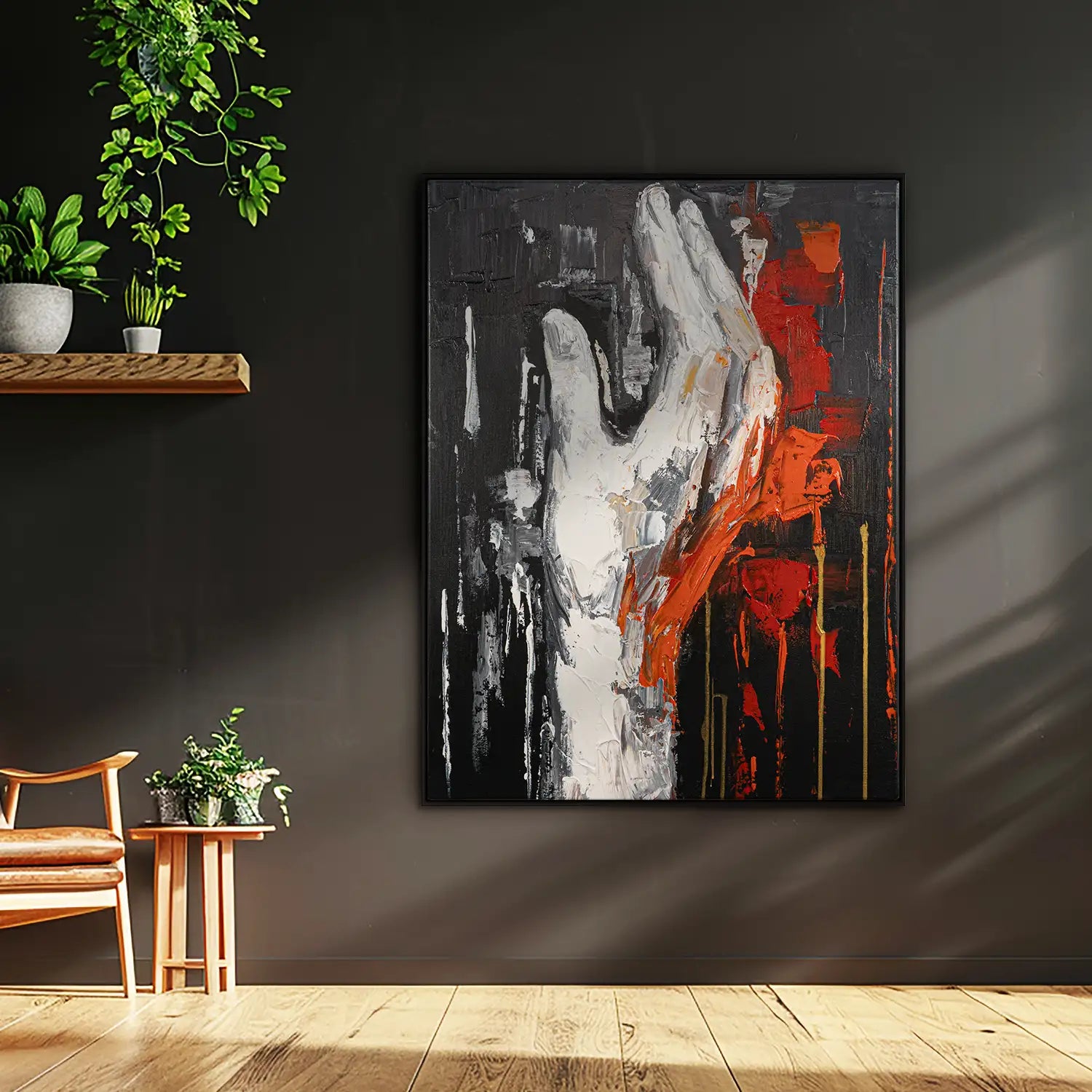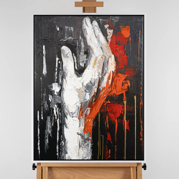 „Flamme des Willens“ ist ein handgemaltes Acrylgemälde auf Leinwand, das pure Energie verkörpert. Eine weiße Hand ragt aus der Dunkelheit hervor, auf ihrem Rücken lodert Feuer – Sinnbild für Sehnsucht, Widerstand und Lebenswillen. Strukturpaste und kräftige Acrylfarben verleihen der Szene Tiefe und Dynamik