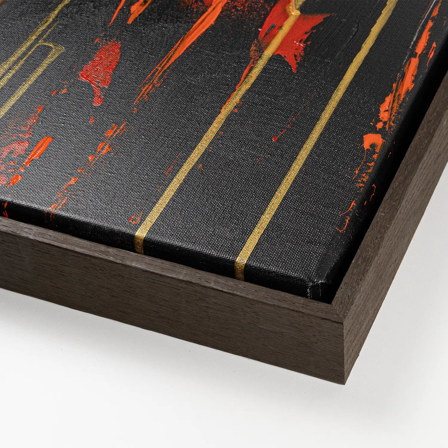 Dieses abstrakte Acrylfarben-Leinwandgemälde mit handgemalten Details entfaltet eine Vielzahl an Optionen: Verschiedene Größen und Rahmenvarianten laden dazu ein, jenes Zusammenspiel zu entdecken, das sich perfekt in die Symphonie Ihrer Raumgestaltung einfügt.