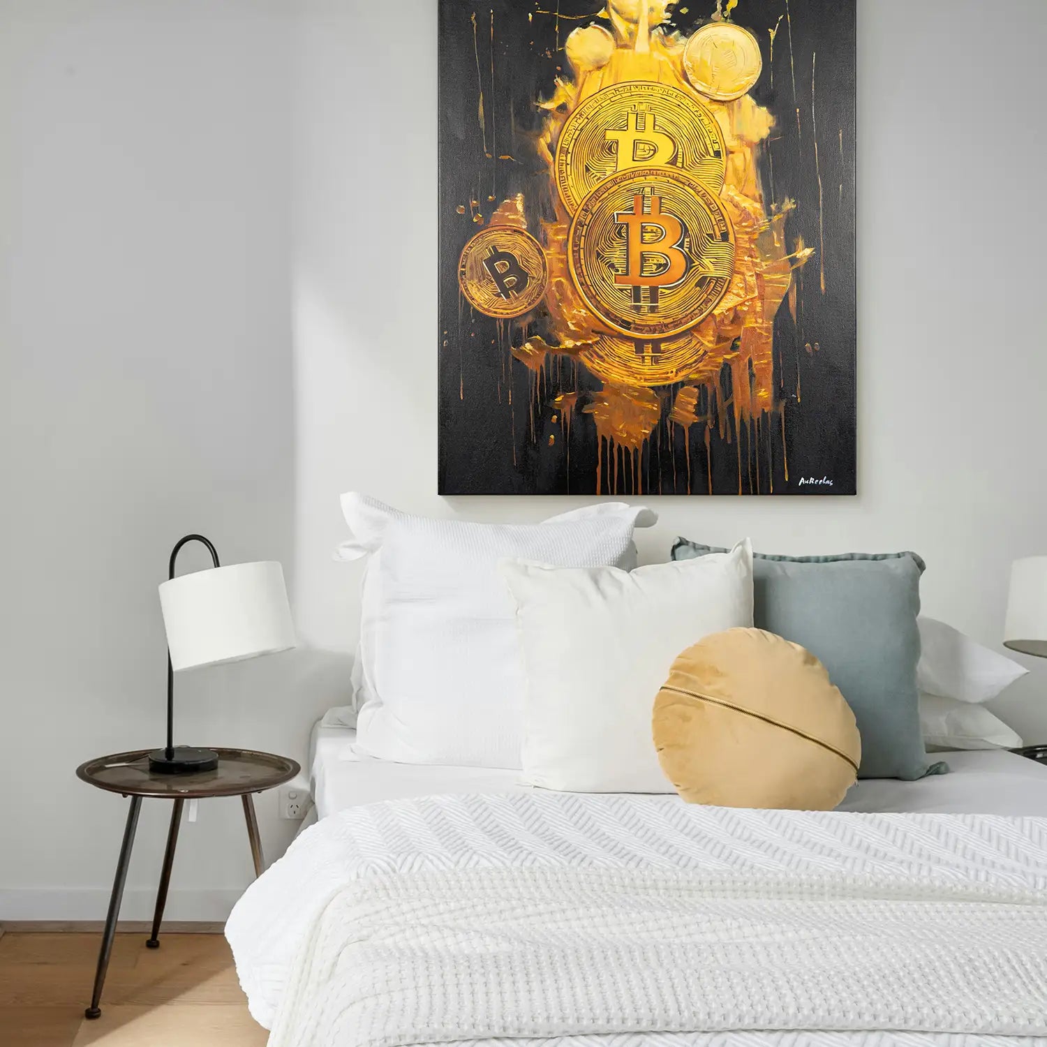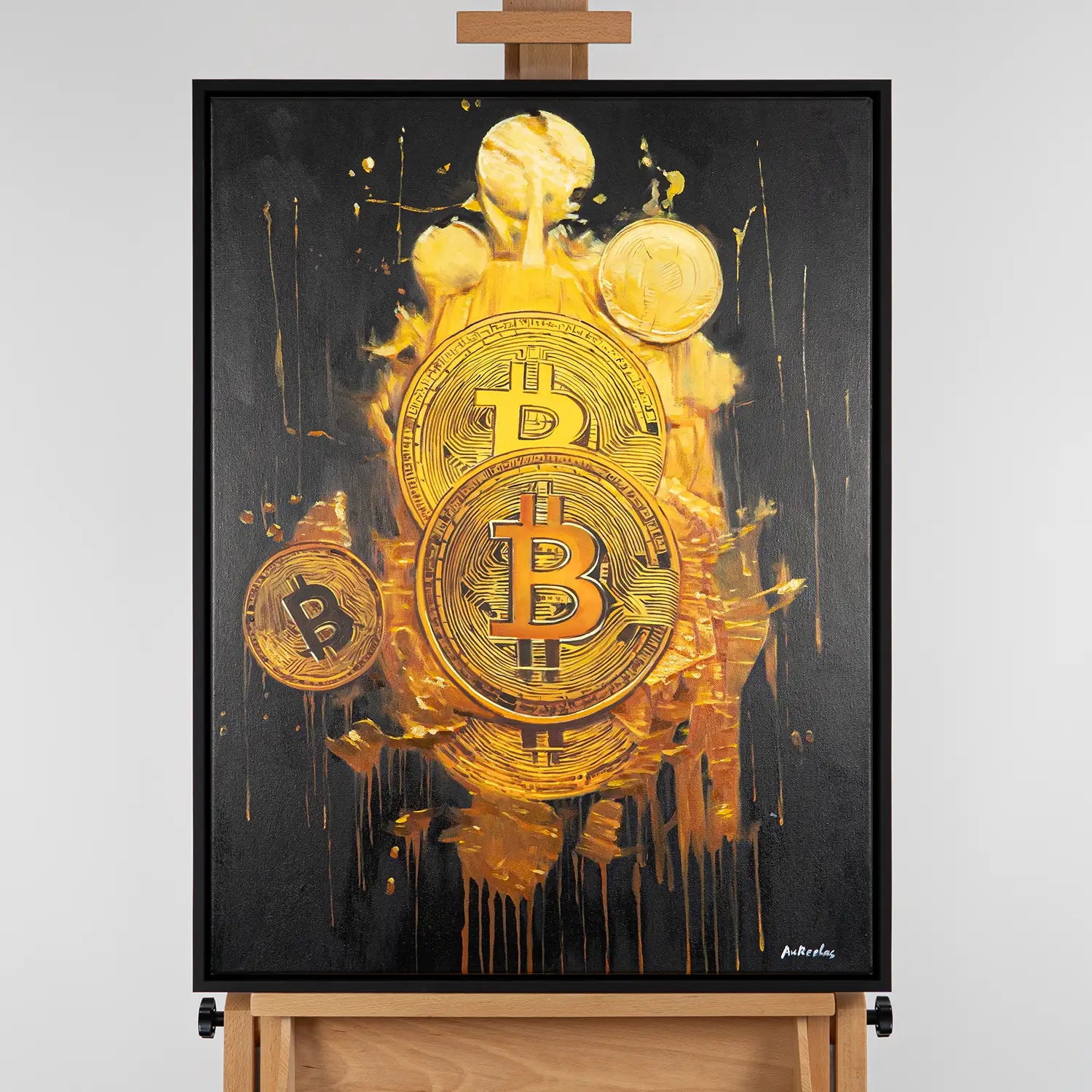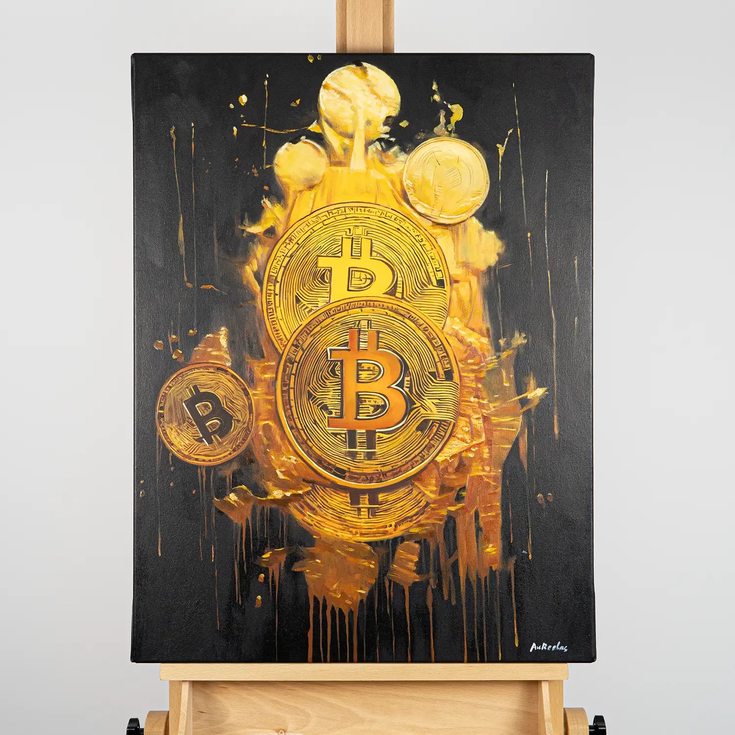 Goldene Illusionen - ein handgemaltes-Gemälde, Bitcoin - das den Glanz und die Vergänglichkeit des Erfolges des modernen Reichtums einfängt. im Hochformat