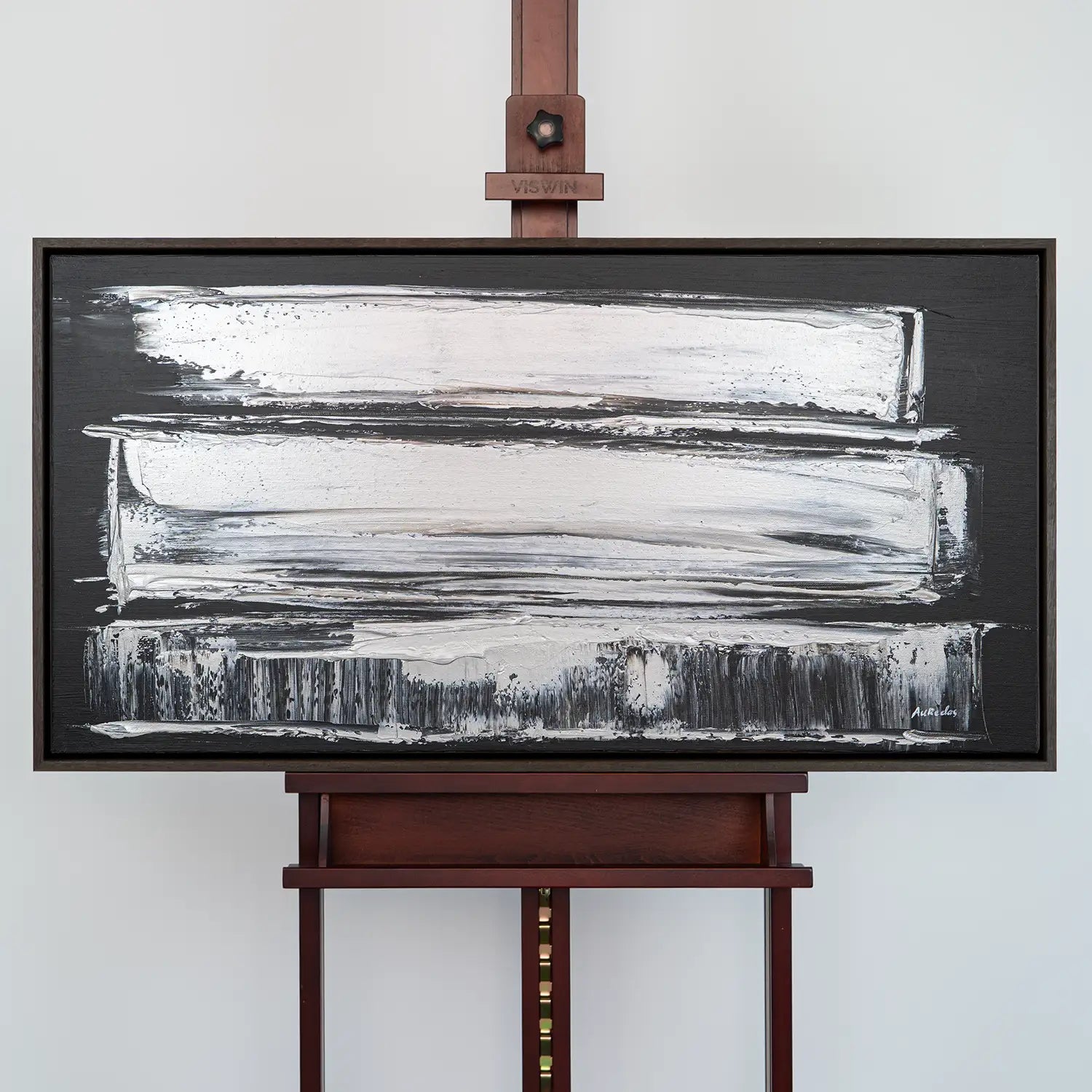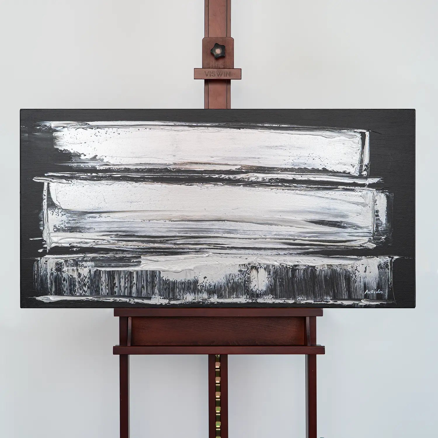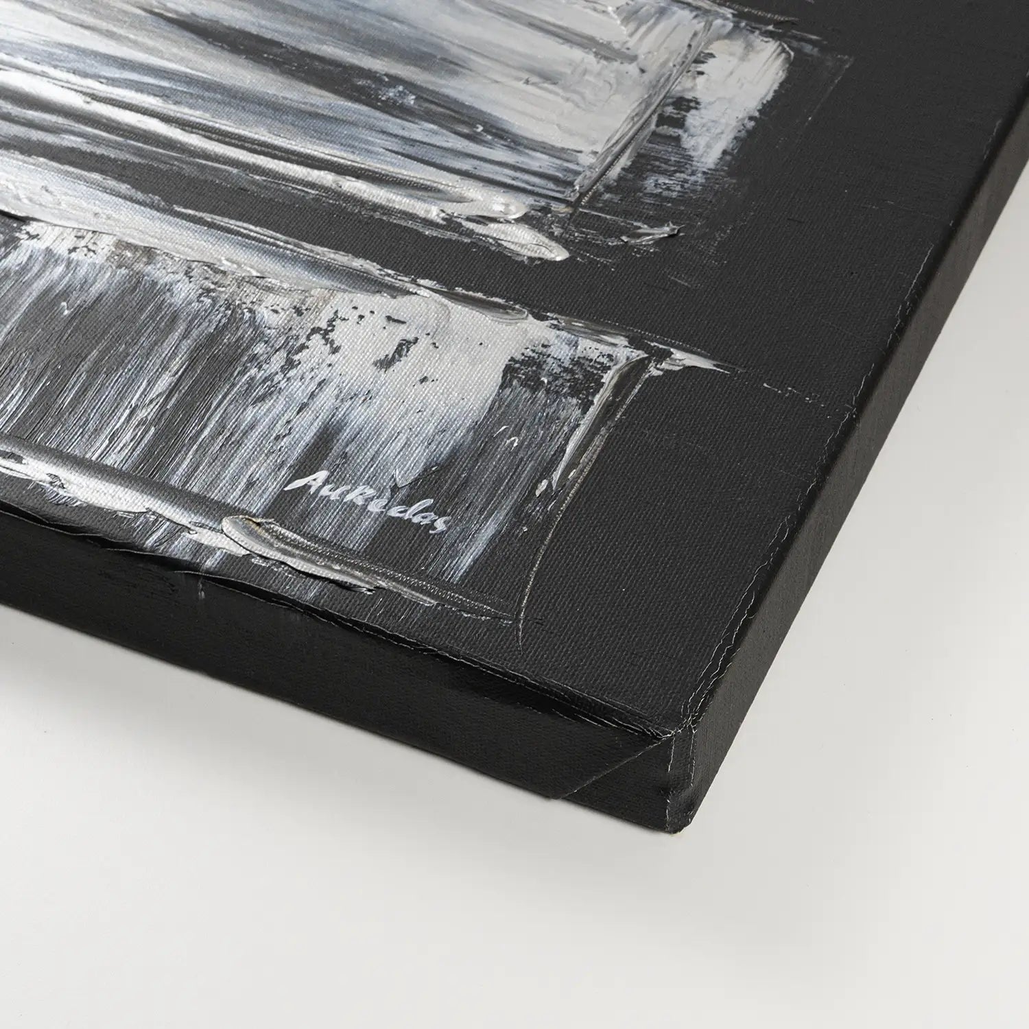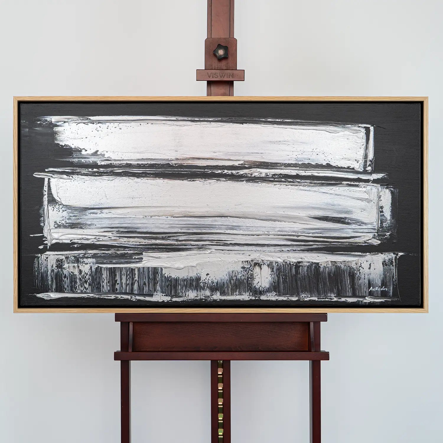 Schwarz und Silber dominieren das Bild und schaffen einen faszinierenden Kontrast zwischen Tiefe und Reflexion. Der metallische Glanz lässt die Oberfläche lebendig wirken, während Strukturpaste feine Reliefs bildet. Auf einem 4 cm Echtholz-Keilrahmen gefertigt, präsentiert sich das Werk modern, klar und luxuriös reduziert.