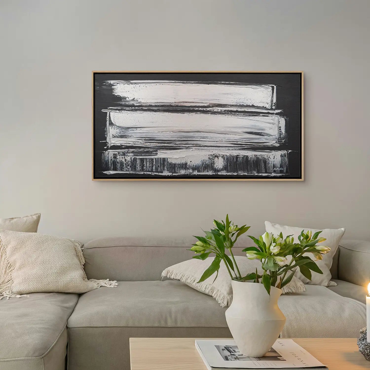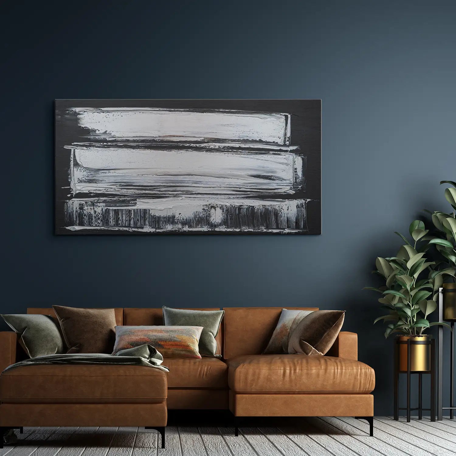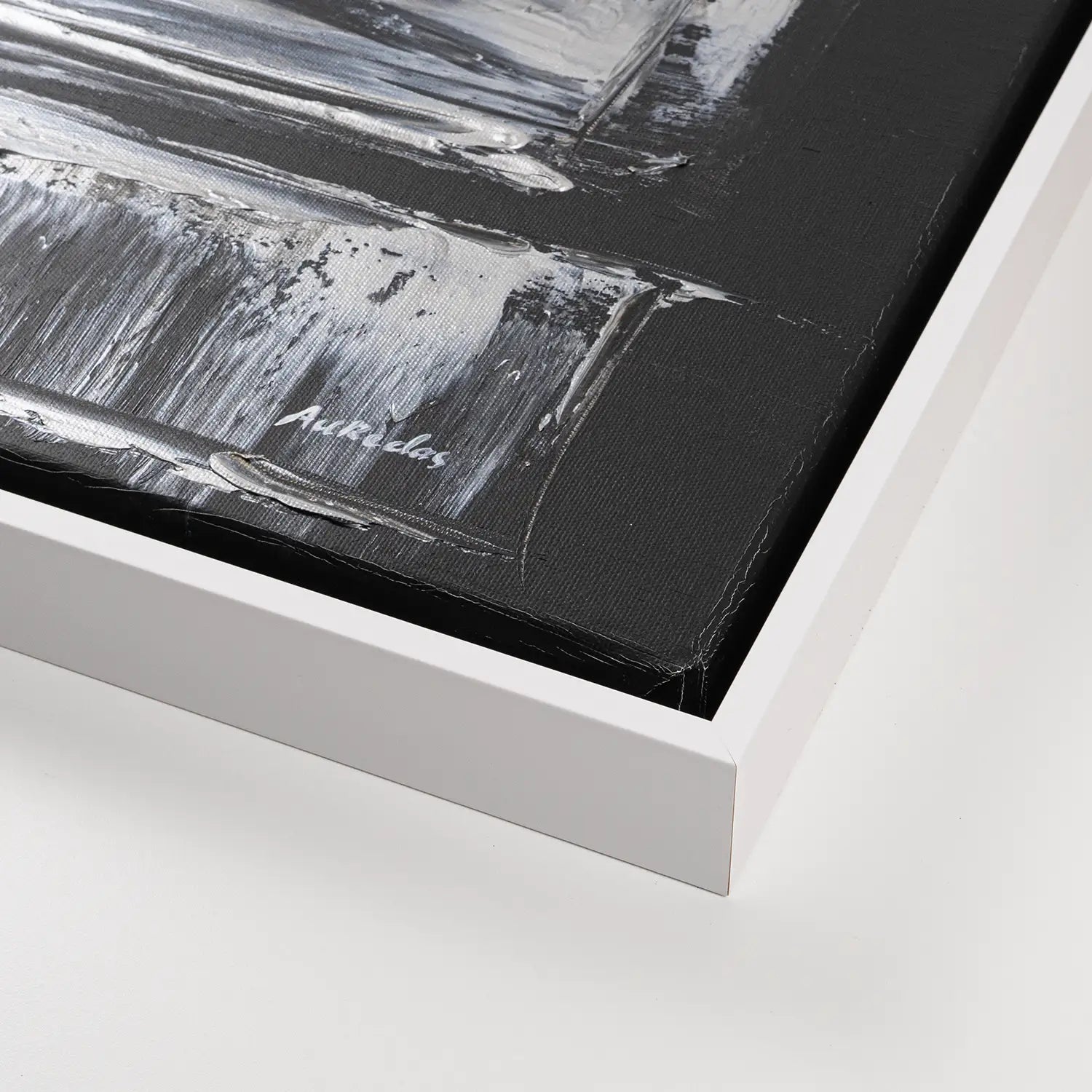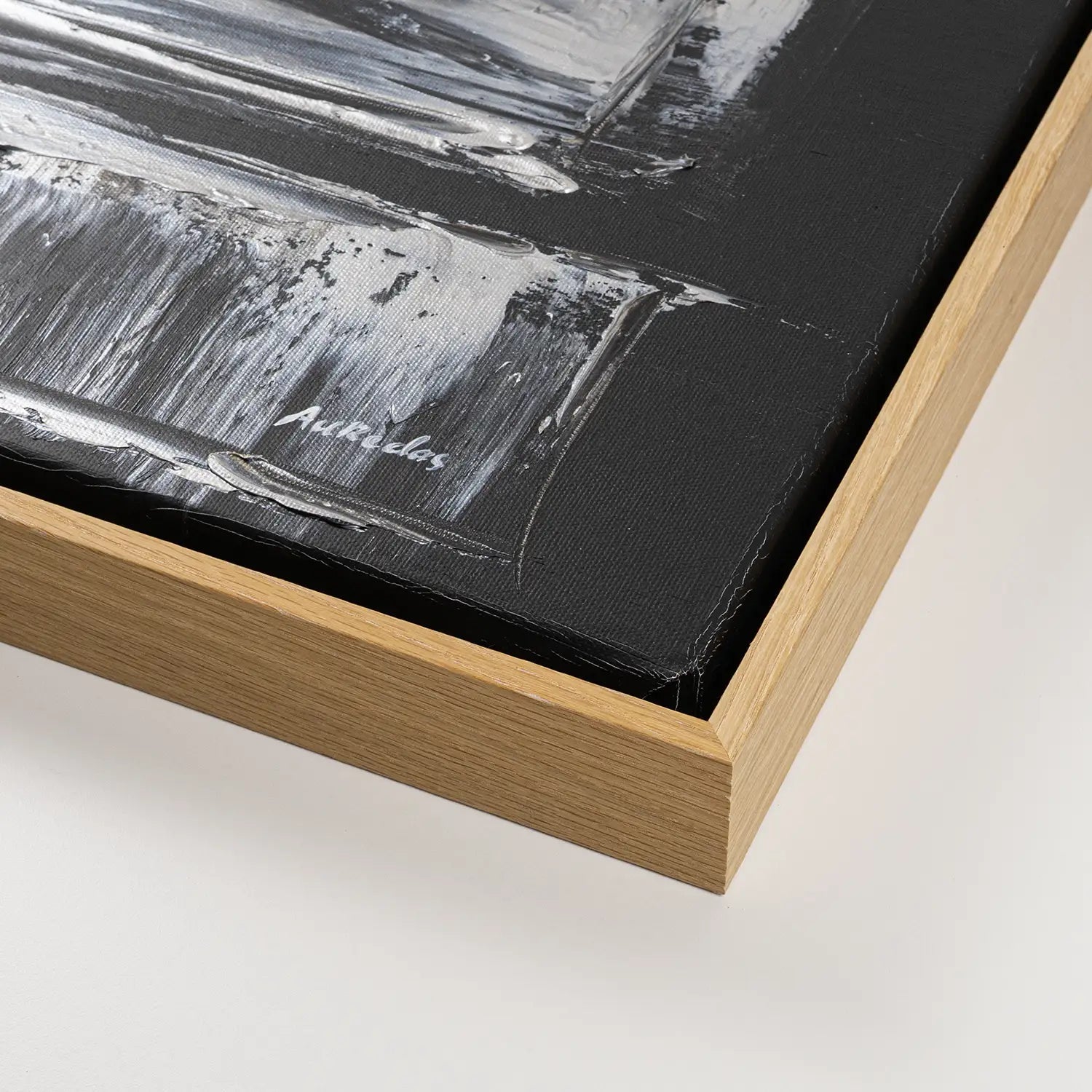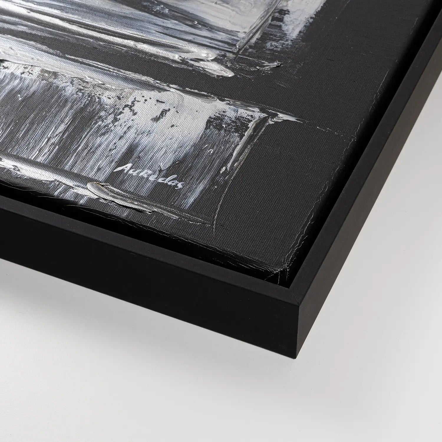 Schwarz und Silber dominieren das Bild und schaffen einen faszinierenden Kontrast zwischen Tiefe und Reflexion. Der metallische Glanz lässt die Oberfläche lebendig wirken, während Strukturpaste feine Reliefs bildet. Auf einem 4 cm Echtholz-Keilrahmen gefertigt, präsentiert sich das Werk modern, klar und luxuriös reduziert.