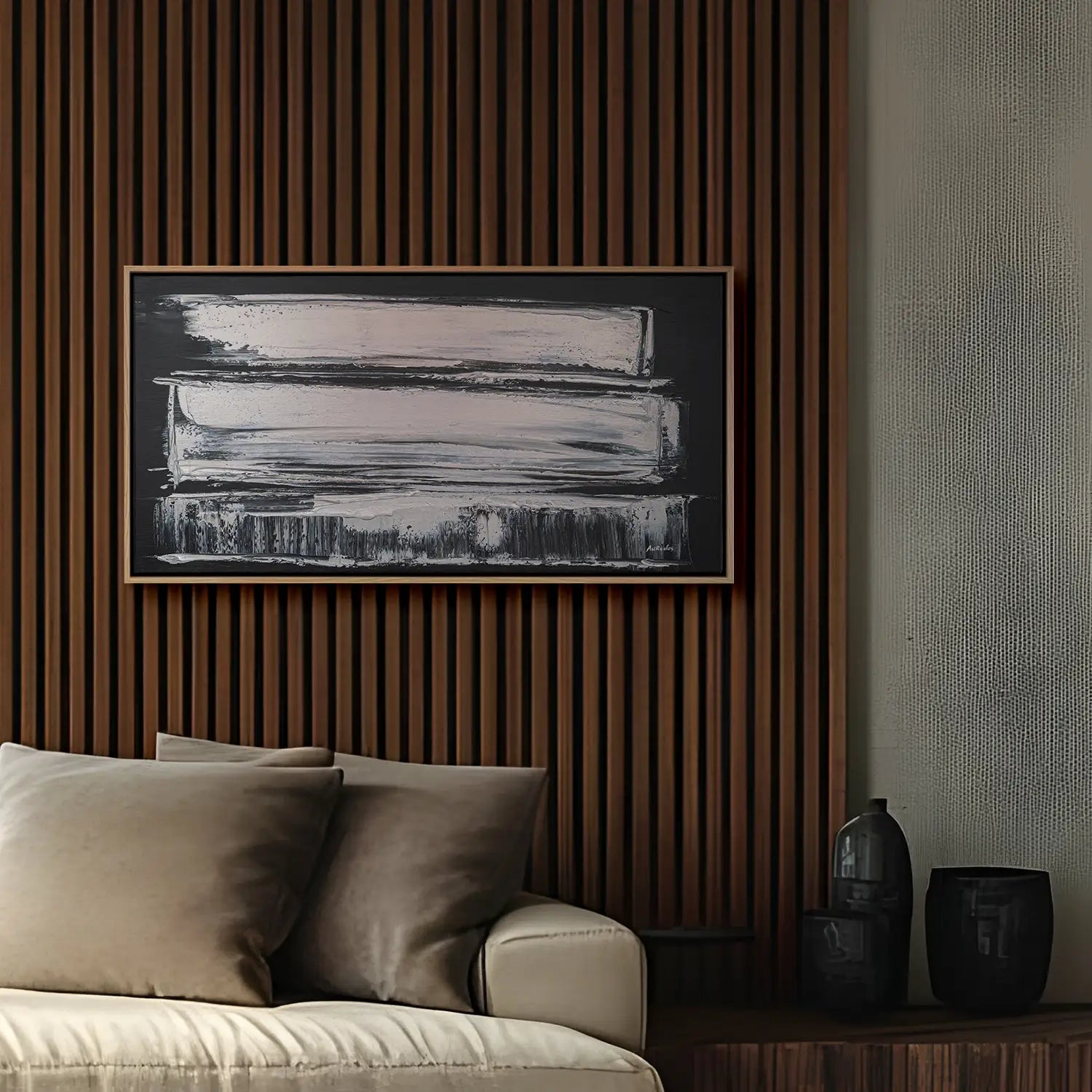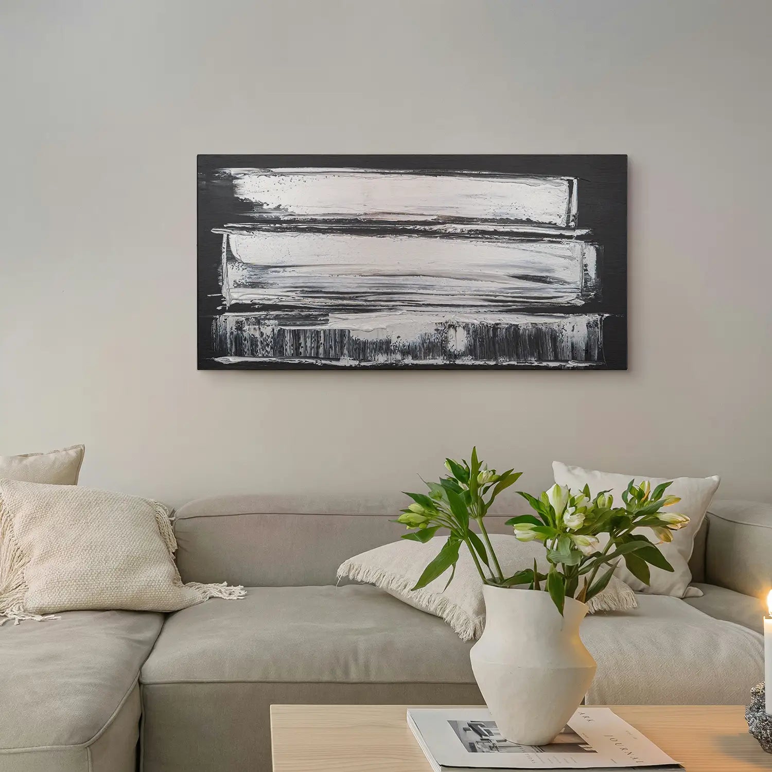 Klang des Metalls - Ein handgemaltes Acrylgemälde auf Leinwand, das die Stille geometrischer Harmonie einfängt. Silberne Rechtecke auf tiefschwarzem Hintergrund im Panorama Format