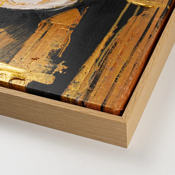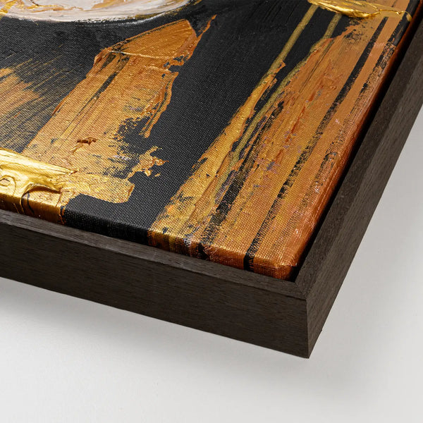 Gold und Schwarz bestimmen den Kontrast dieses außergewöhnlichen Gemäldes. Das edle Metallgold wirkt lebendig und reflektiert das Licht, während tiefes Schwarz Ruhe und Tiefe schafft. Strukturpaste verstärkt den plastischen Ausdruck. Auf 4 cm Echtholz-Keilrahmen gearbeitet, optional mit Schattenfugenrahmen in Weiß oder Schwarz (foliert) sowie Eiche Hell oder Eiche Dunkel (in Echtholz-Optik).