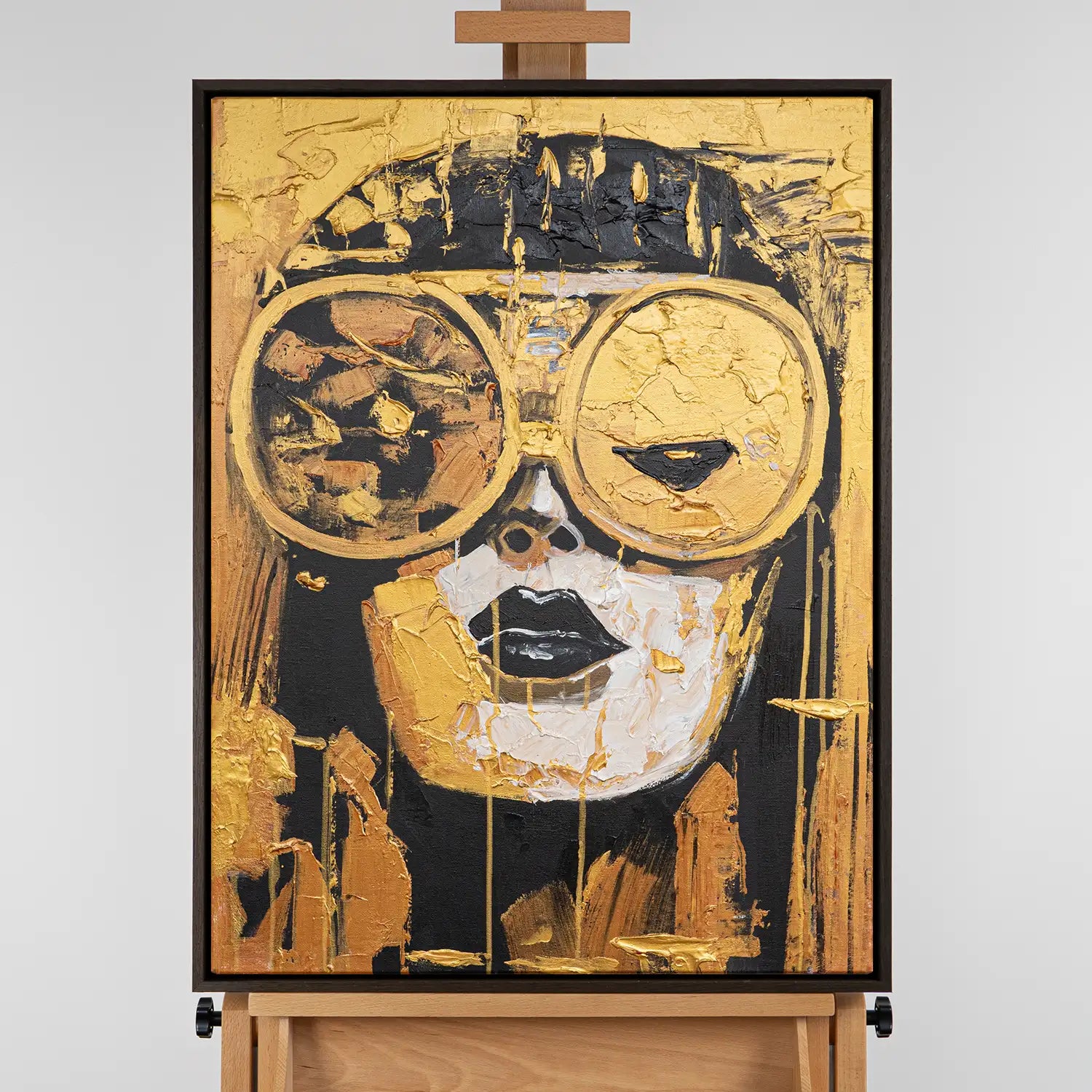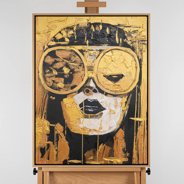Das Gemälde zeigt eine Frau, deren goldene Brille den Blick in eine glänzende Zukunft symbolisiert. Ihre kühle, fast entrückte Erscheinung verbindet Eleganz mit moderner Distanz. Zwischen Luxus und Isolation reflektiert dieses Werk die Ambivalenz des Fortschritts – eine Hommage an Selbstbewusstsein im Zeitalter des Glanzes.