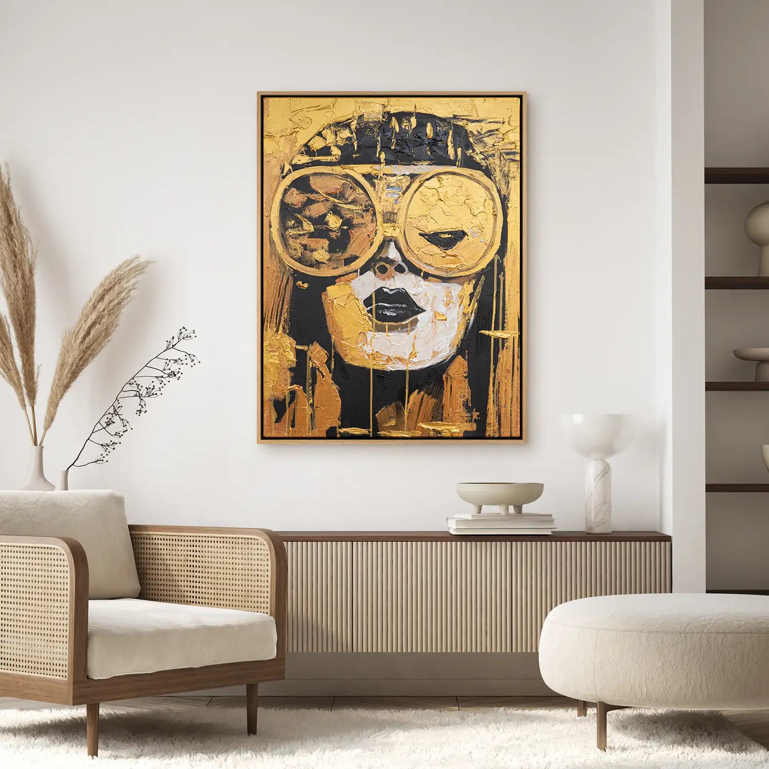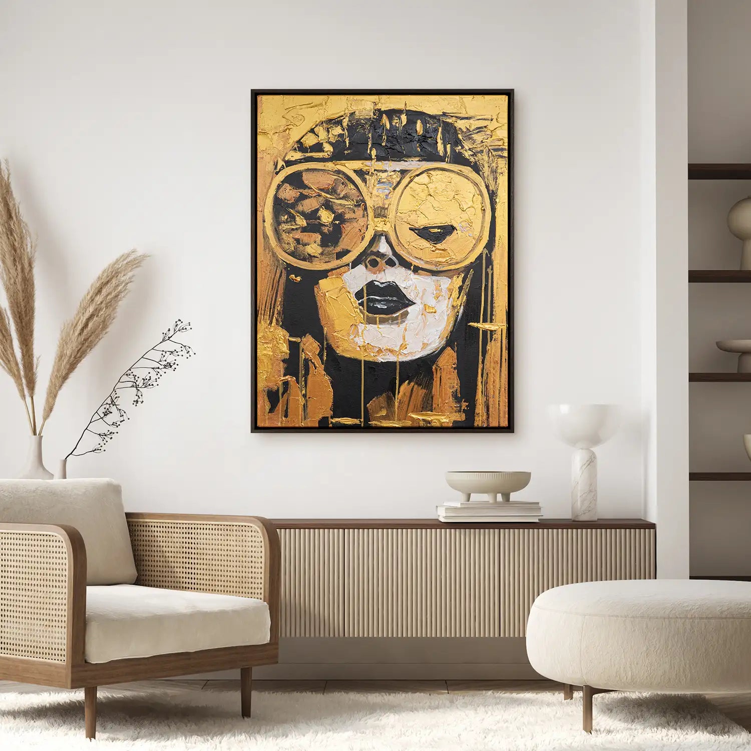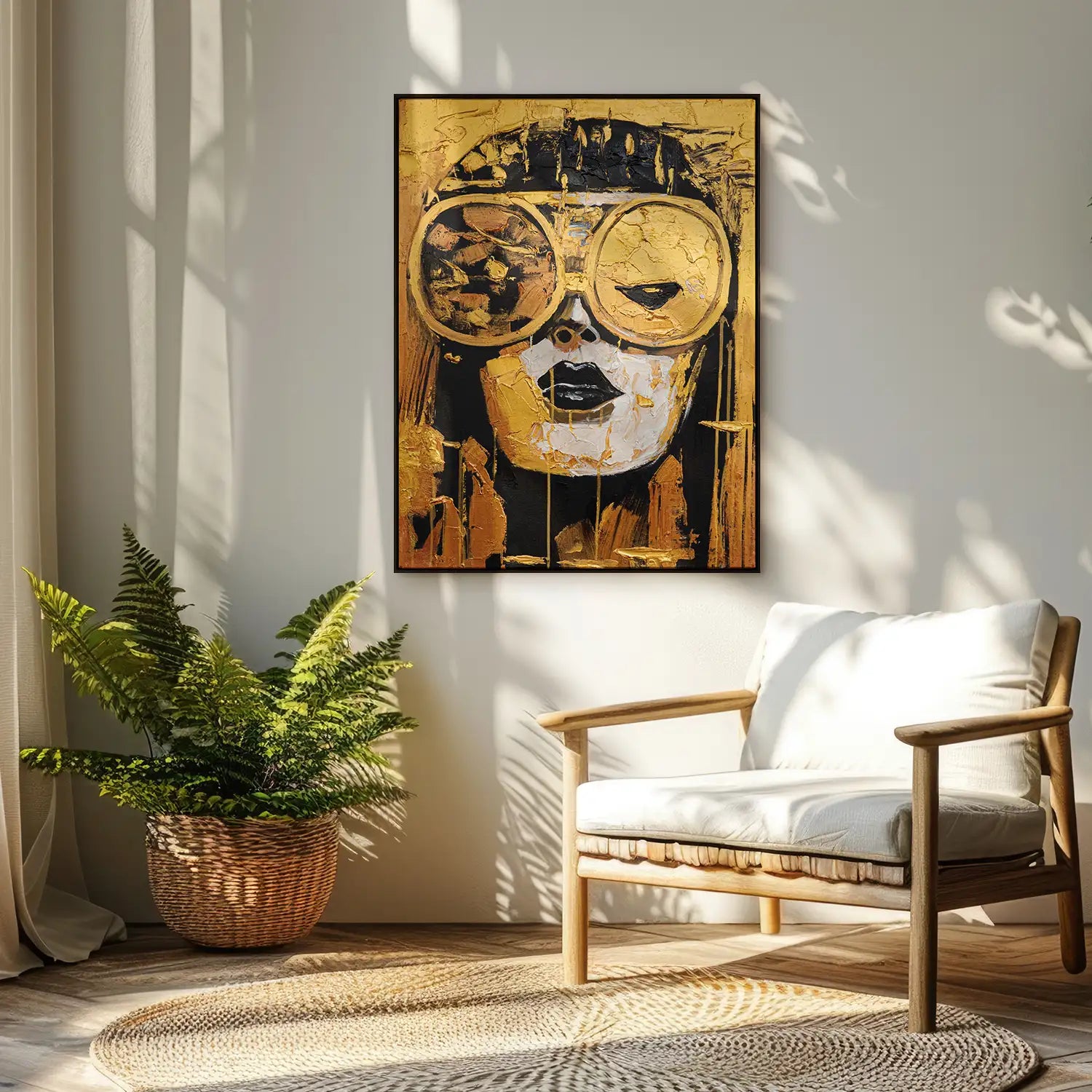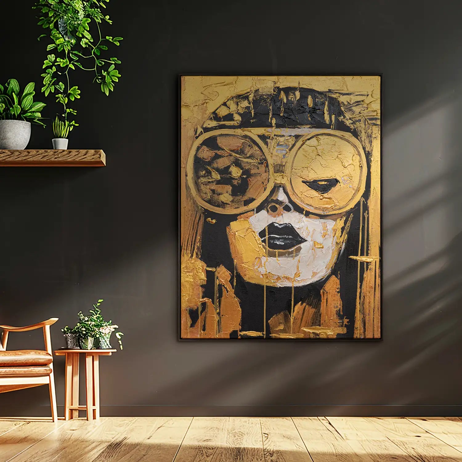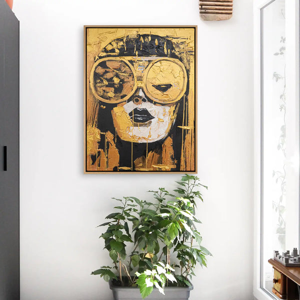 Ein kraftvolles, handgemaltes Gemälde in Gold und Schwarz. Auf Leinwand mit 4cm Keilrahmen entfaltet sich ein futuristisches Frauenportrait mit großer Brille, abstrakt und kühl zugleich. Strukturpaste und Acrylfarbe verleihen Tiefe – ein Blick in die Zeit, zugleich Luxus und Vision
