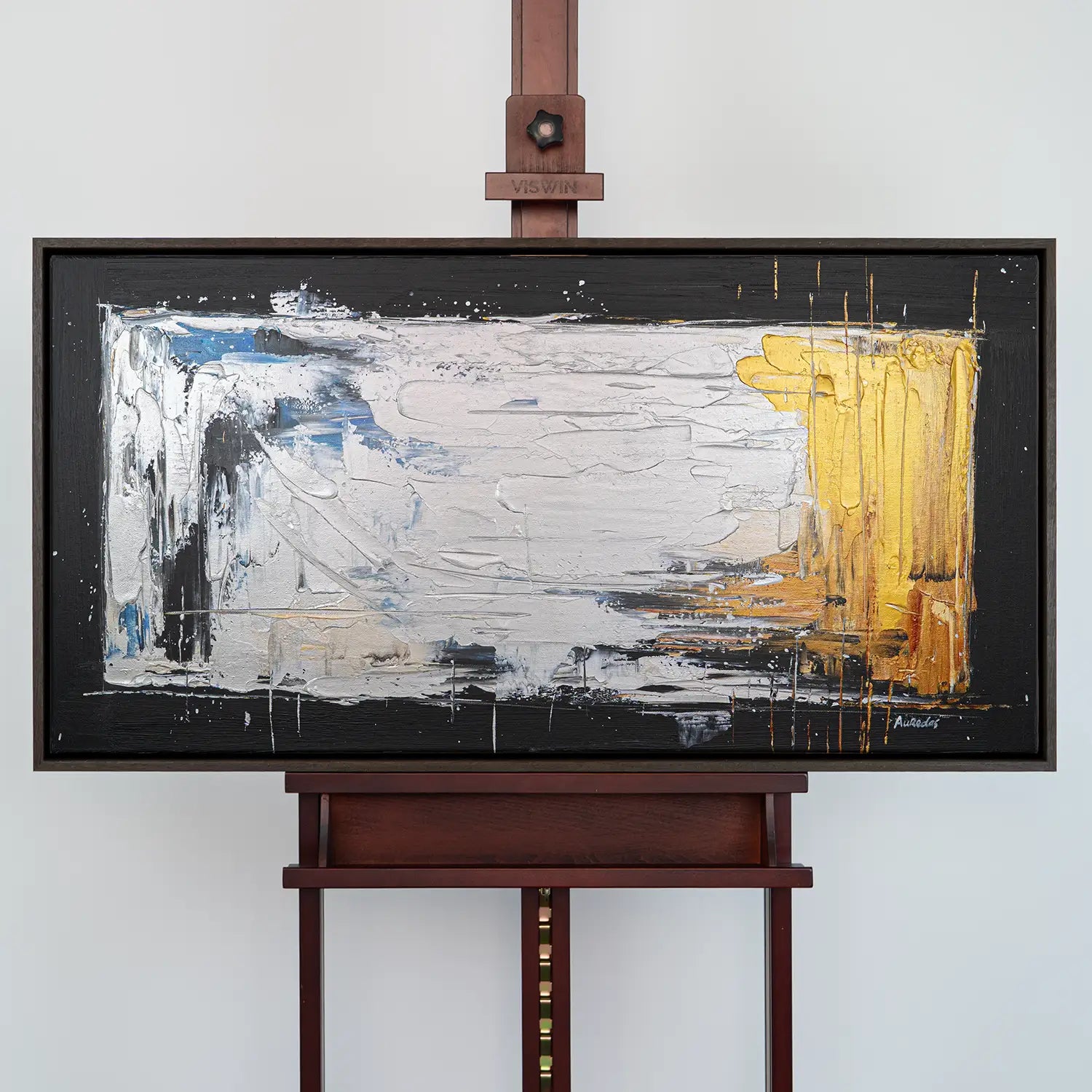 Schwarz als Tiefe, Silber als markanter Glanzpunkt – diese Kombination erzeugt eine klare, moderne Ästhetik. Feine Strukturpaste setzt Reliefs, die das Licht brechen und subtil reflektieren. Das Werk wirkt minimalistisch und gleichzeitig edel, perfekt gearbeitet auf einem 4 cm Echtholz-Keilrahmen für elegante Präsenz.