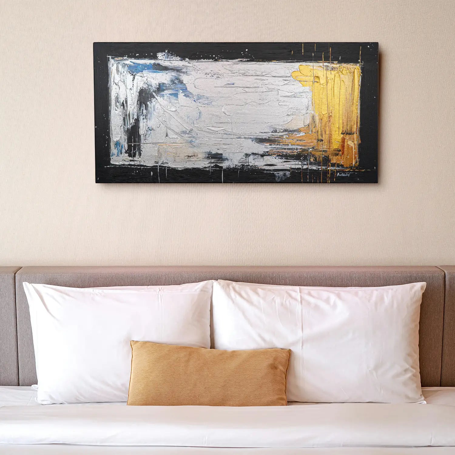 „Verschmelzen der Elemente“ ist ein minimalistisches Statement-Gemälde – limitiert auf nur drei Exemplare je Größe. Jedes handgemalte Unikat vereint Struktur, Klarheit und metallische Eleganz. Für Individualisten und Sammler, die Kunst als ruhigen Gegenpol und zeitlose Stilgebung schätzen: modern, reduziert und von bleibender Wirkung.