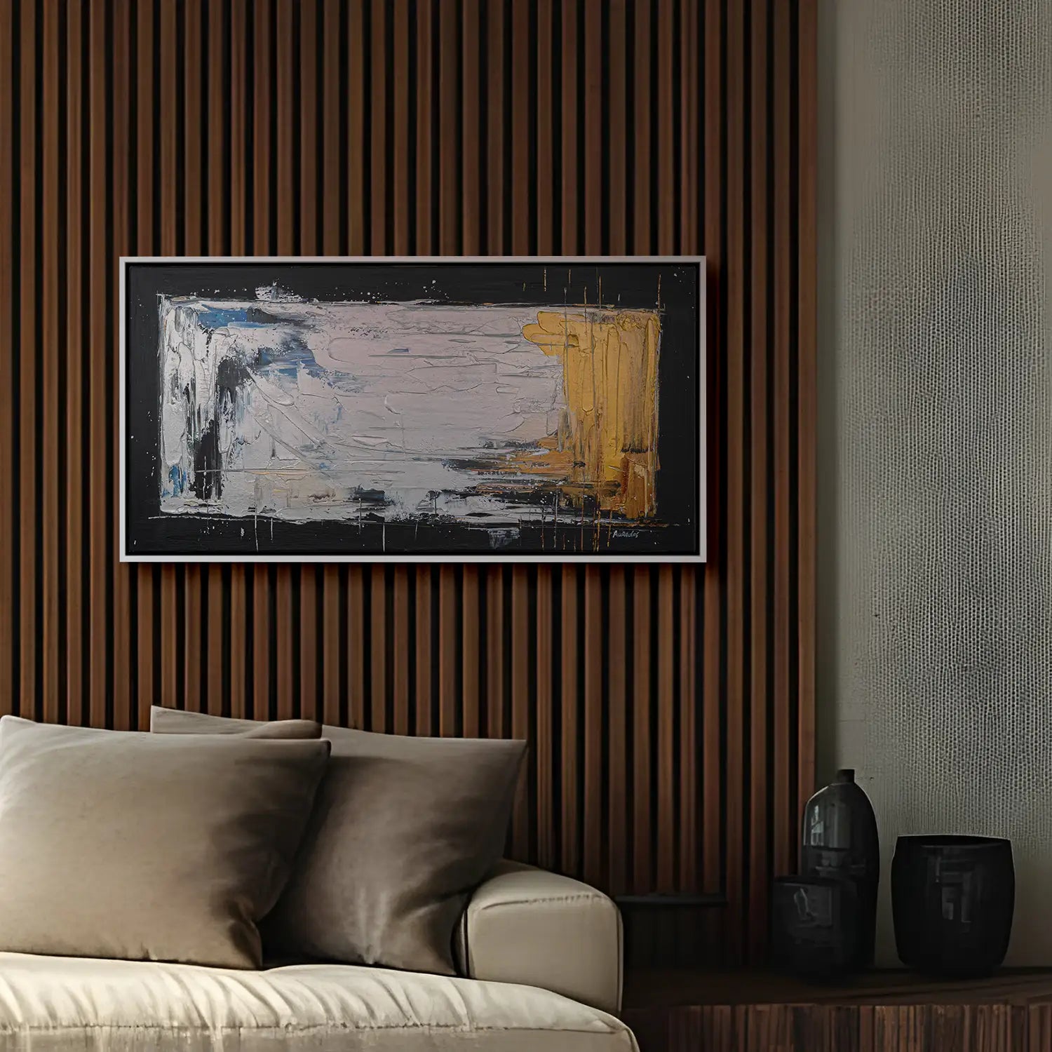 Verschmelzen der Elemente - Ein handgemaltes Acrylgemälde, das ein silbernes, rechteckiges Element zeigt, das aus der Dunkelheit hervorzutreten scheint im Panorama Format